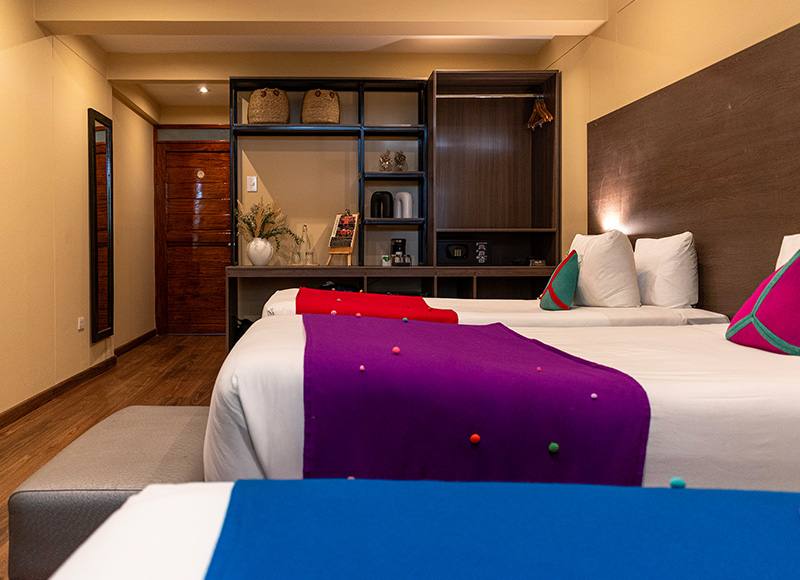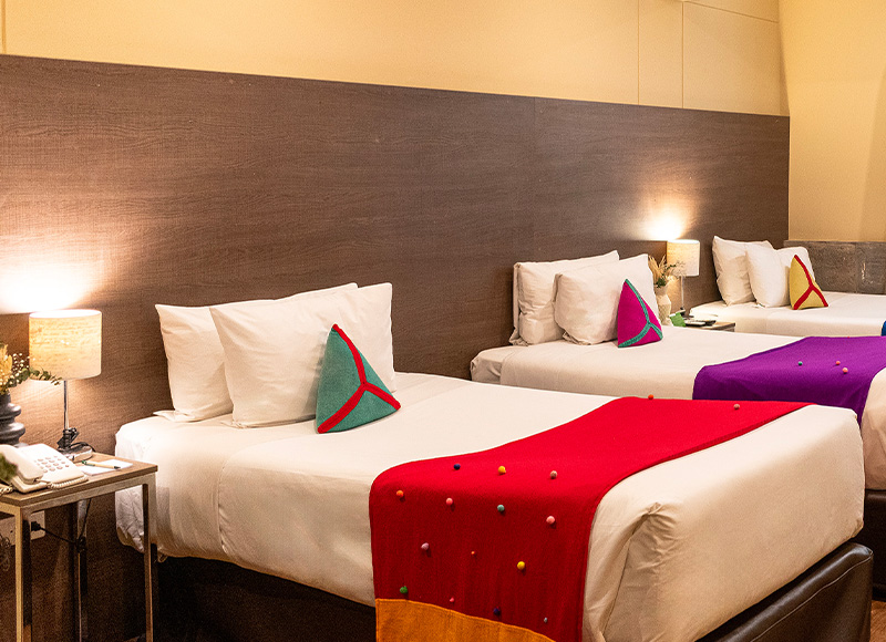 Designed to accommodate three guests comfortably, this spacious room offers ample layout and warm regional accents. A practical yet inviting choice for families or small groups traveling together.